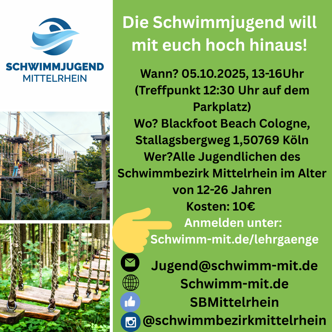 Die Schwimmjugend möchte mit euch Hoch hinaus! Wir möchten mit euch zusammen am 05.10.2025 in den Kletterwald gehen. Drei Stunden Kletterspaß in den Baumwipfeln des Blackfoot Beach Cologne. Es wird eine professionelle Einweisung zum Klettern, einhaken, aushaken ect. Geben.